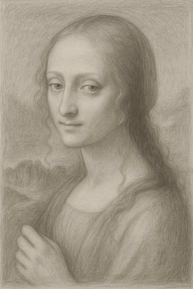 Si tratta di una ricostruzione artistica basata su una testimonianza, elaborata attraverso analisi stilistiche coerenti con la scuola di Leonardo da Vinci. Non si tratta di un'opera autenticata o verificata da Leonardo da Vinci.